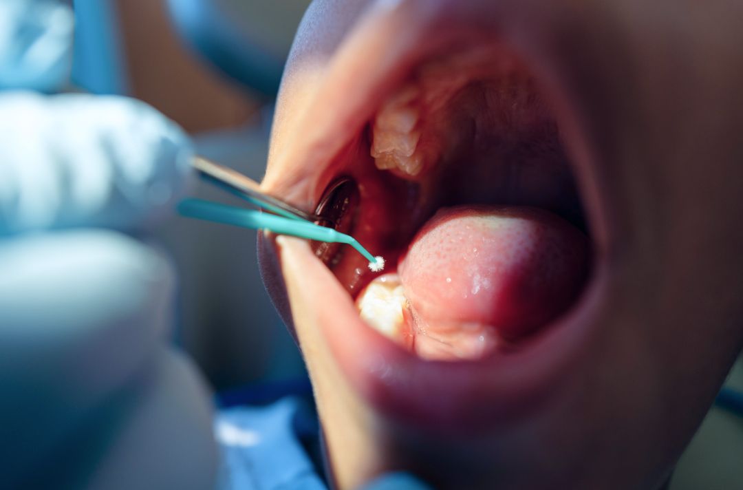 A specialized sulfonated phenol gel shrinks tartar and detaches it from the tooth. This “desiccation therapy” makes deep cleanings dramatically more comfortable. It is applied again after the cleaning, permanently removing gum disease microbes that otherwise persist.